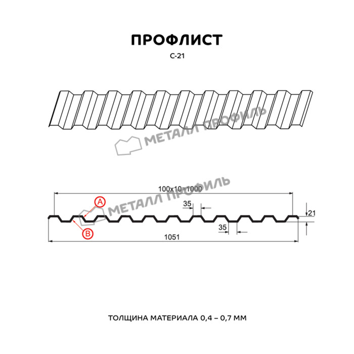 Профиль С-21 имеет толщину 0,5 мм, что обеспечивает прочность и долговечность конструкции. Он изготовлен из металла, что делает его устойчивым к воздействию внешних факторов, таких как коррозия и погодные условия.