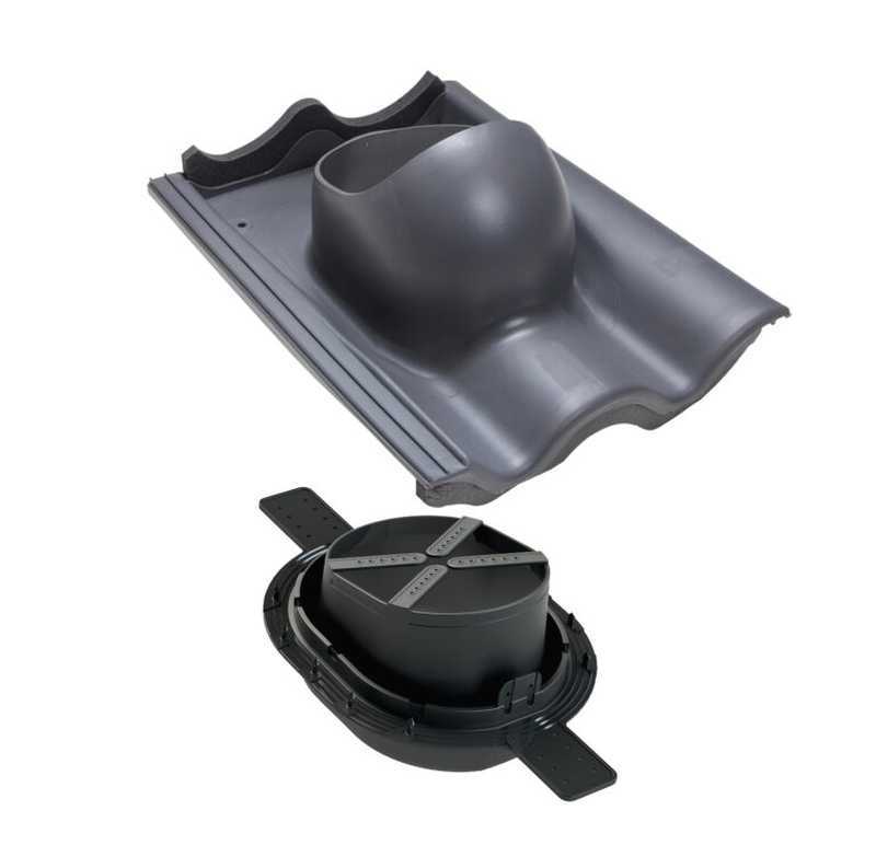 Проходной элемент для цементно-песчаной черепицы. Заменяет одну двухволновую черепицу шириной 330 мм и высотой волны 27 -40 мм. В комплект входит двухкомпонентный 2K -уплотнитель гидрозатвора, гарантирующий полную герметичность прохода через гидрозащитную пленку. Устанавливается при монтаже и на готовую кровлю.
